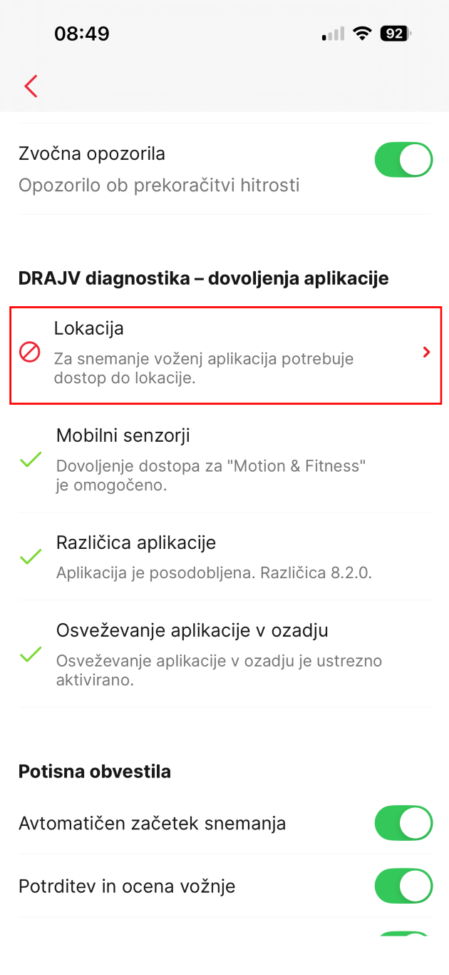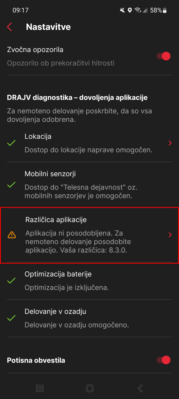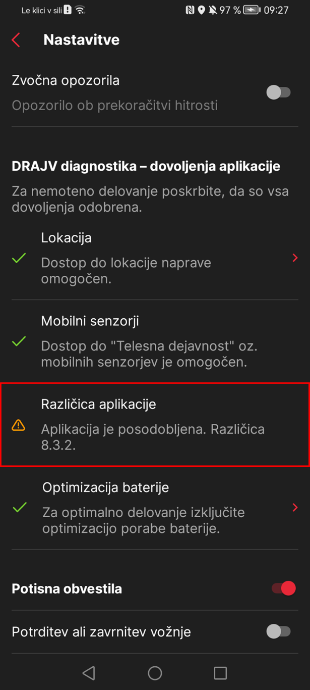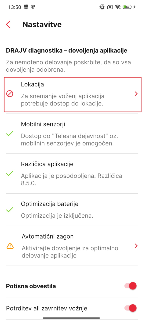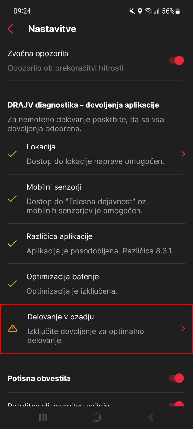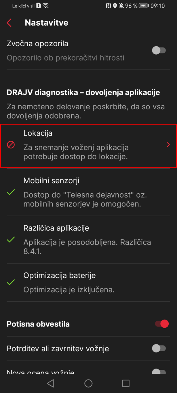 V nastavitvah aplikacije DRAJV v razdelku DRAJV diagnostika – dovoljenja aplikacije preverite, ali imate nastavljena ustrezna dovoljenja. Aplikacija bo pravilno delovala, če bo vsako dovoljenje označeno z »zeleno kljukico«