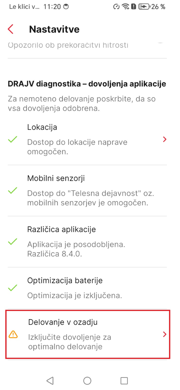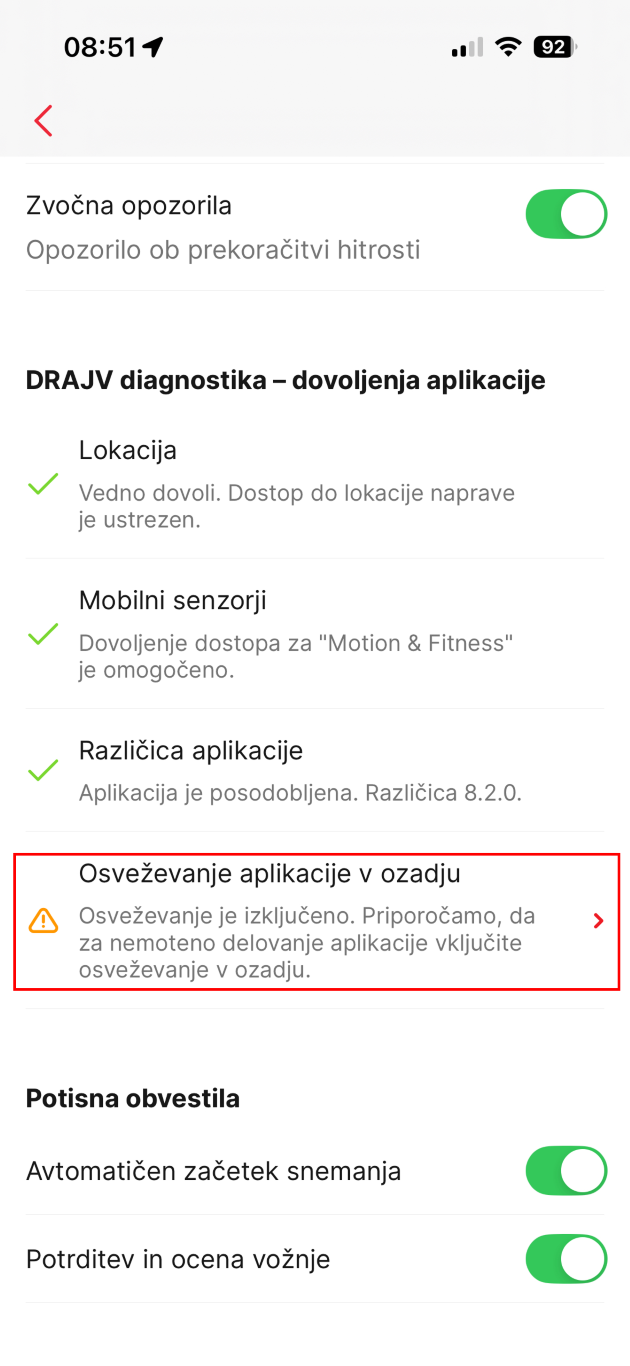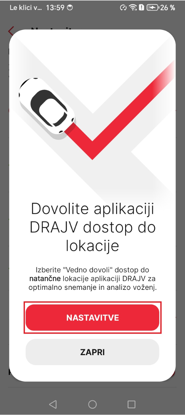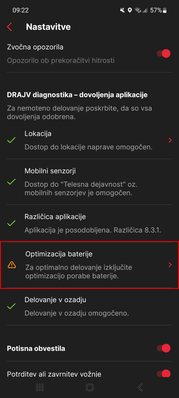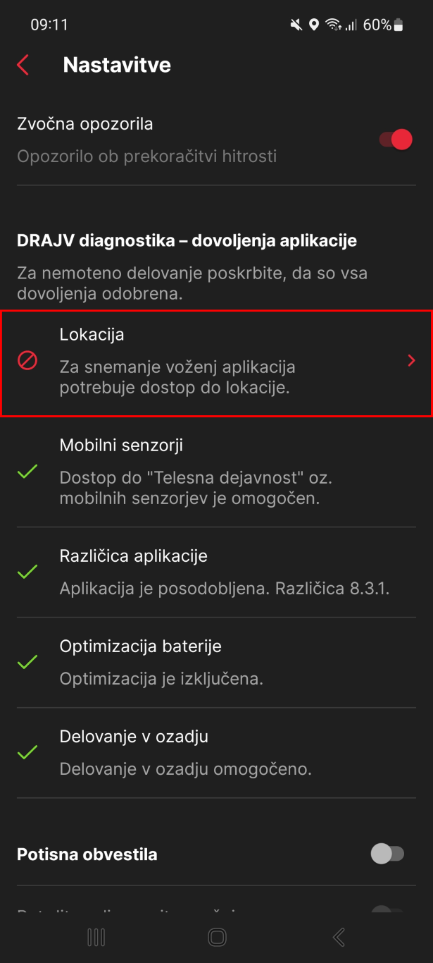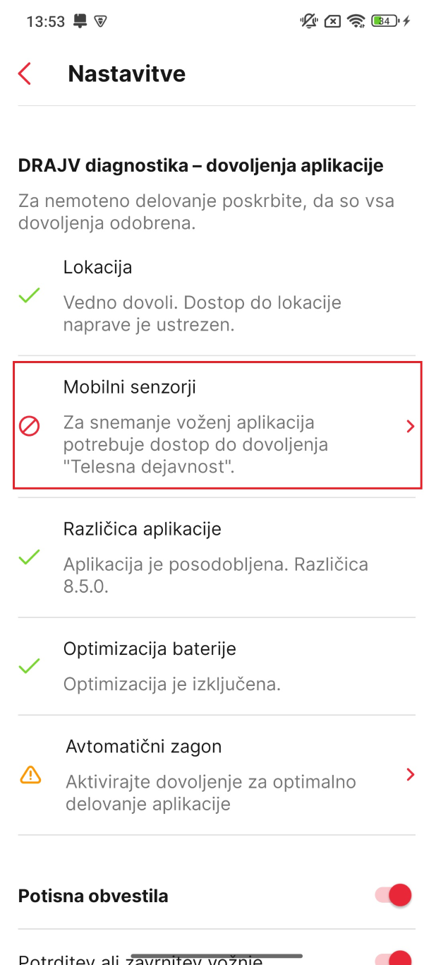 V nastavitvah aplikacije DRAJV v razdelku DRAJV diagnostika – dovoljenja aplikacije preverite, ali imate nastavljena ustrezna dovoljenja. Aplikacija bo pravilno delovala, če bo vsako dovoljenje označeno z »zeleno kljukico«