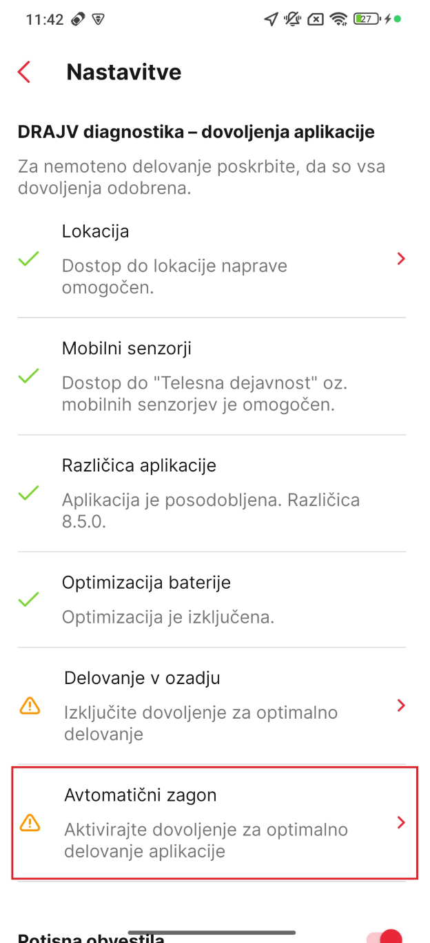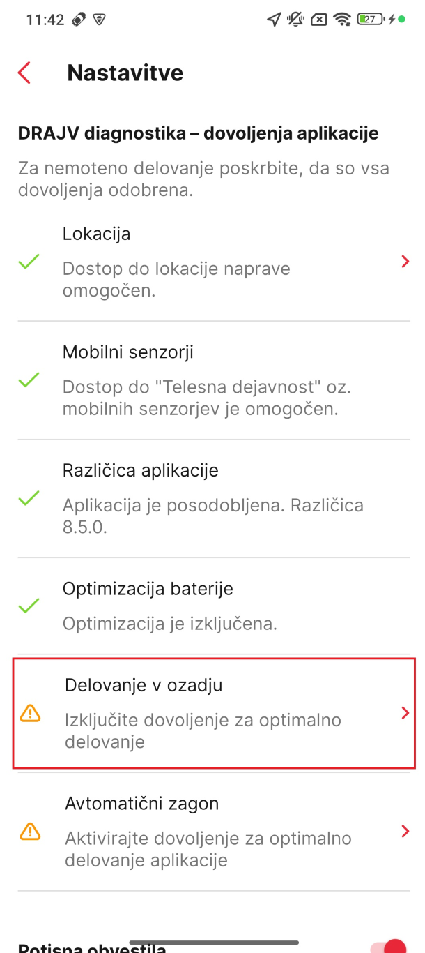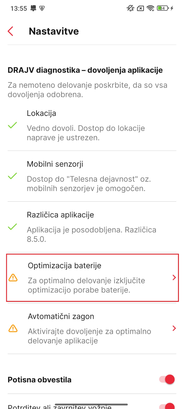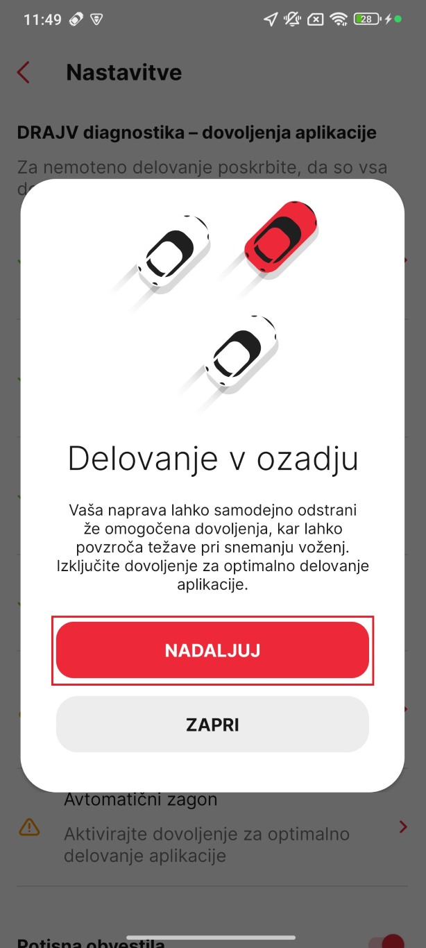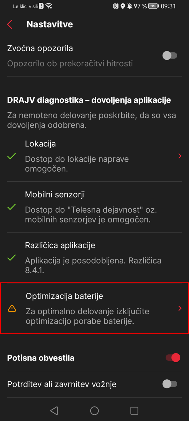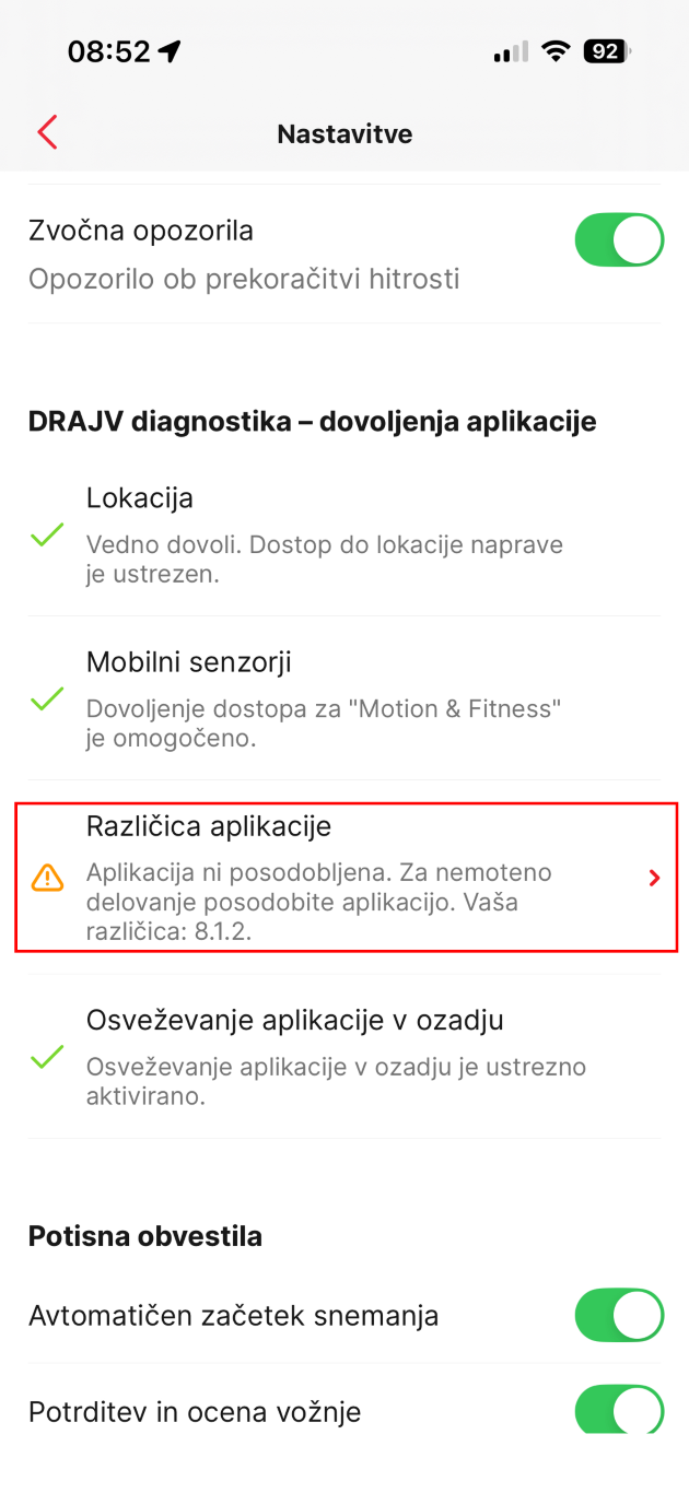V nastavitvah aplikacije DRAJV v razdelku DRAJV diagnostika – dovoljenja aplikacije preverite, ali imate nastavljena ustrezna dovoljenja. Aplikacija bo pravilno delovala, če bo vsako dovoljenje označeno z »zeleno kljukico«
