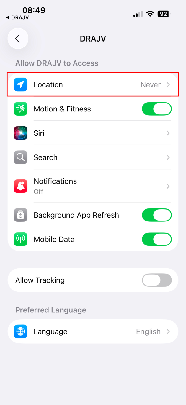 - Preverite, da imate v sistemskih nastavitvah aplikacije DRAJV omogočen dostop do lokacije. Izberite nastavitev 'While Using the App' ali 'Always'.