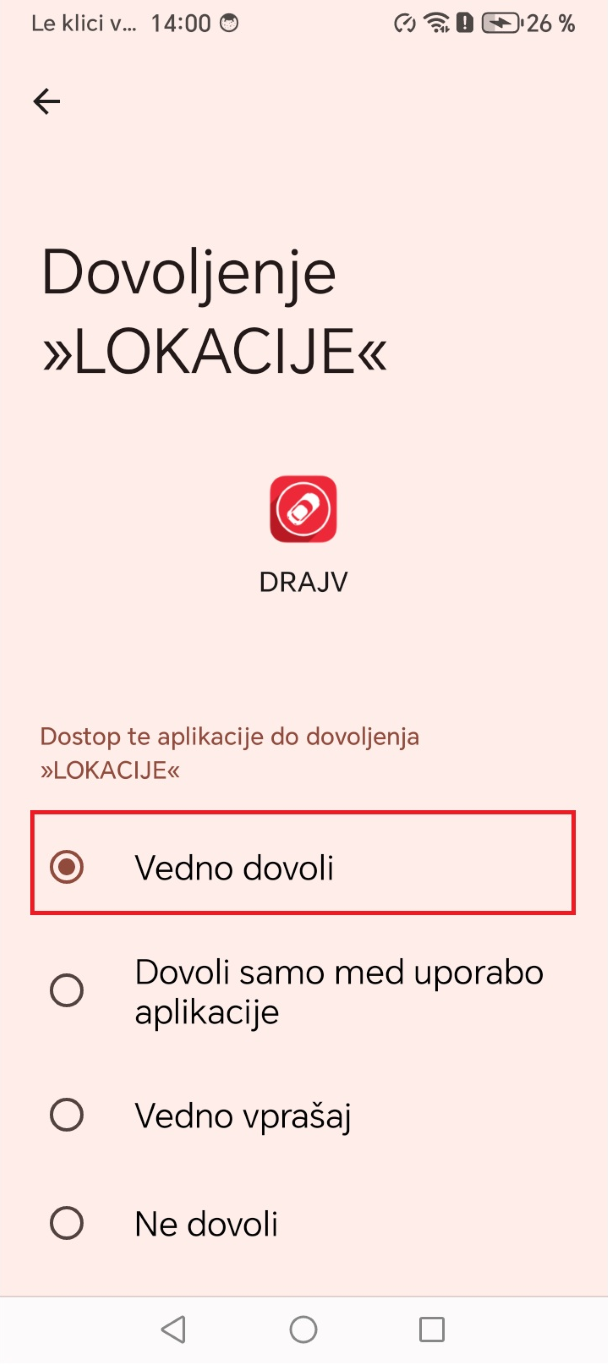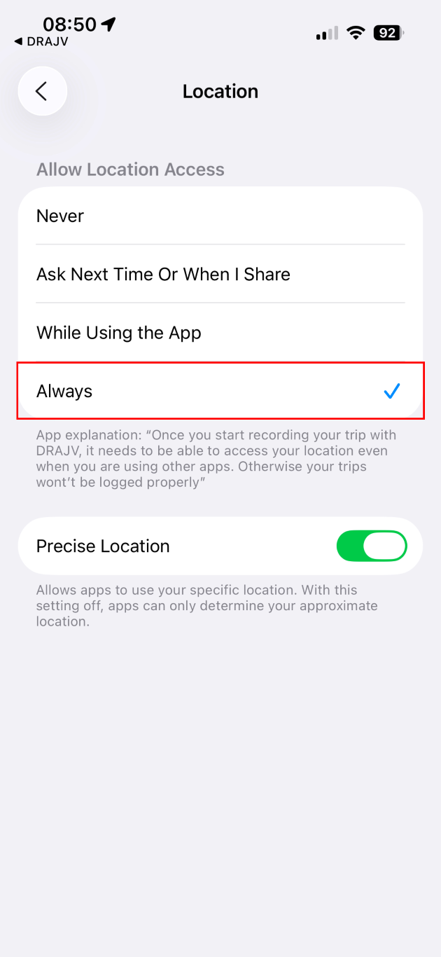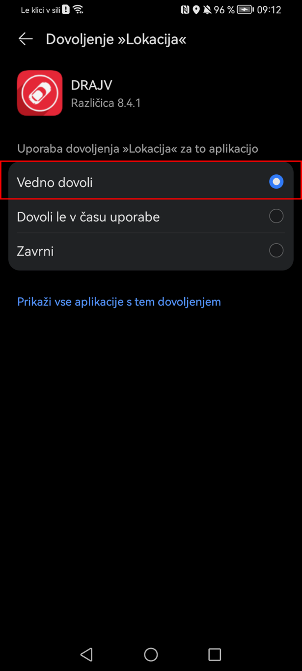 - Preverite, da imate v nastavitvah lokacije omogočen dostop za aplikacijo DRAJV. Izberite možnost 'Vedno dovoli' ali 'Dovoli samo med uporabo aplikacije'.