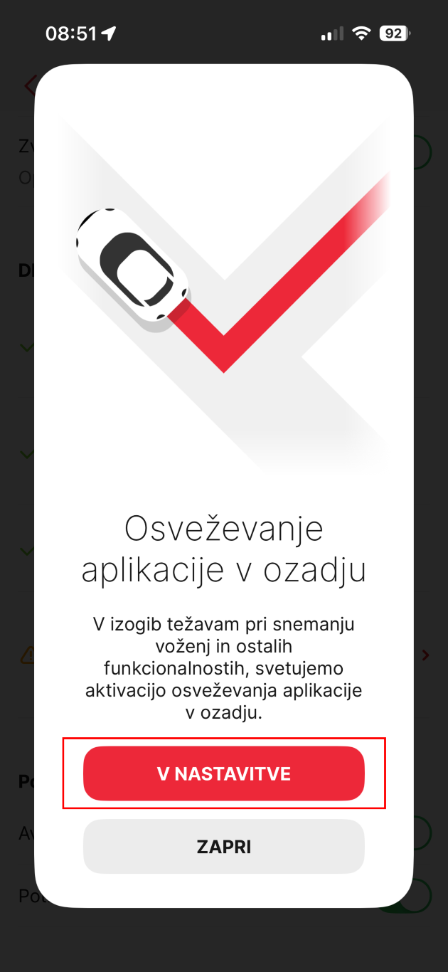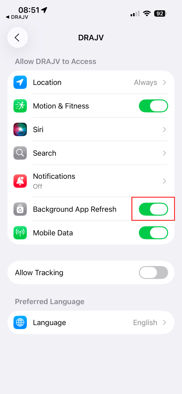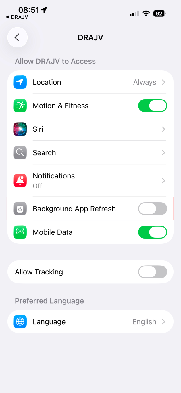 - Preverite, da imate v sistemskih nastavitvah aplikacije DRAJV omogočeno osveževanje aplikacije v ozadju. Vklopite nastavitev 'Background App Refresh'.