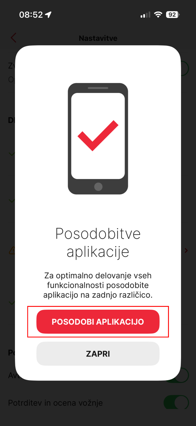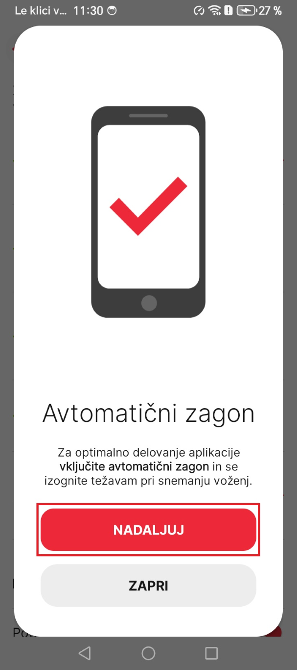 Če vožnje v tem času ne zavrnete, ta šteje kot potrjena in se upošteva pri vaši skupni oceni voženj. Za pravilno delovanje te funkcionalnosti je pomembno, da telefon namestite v nosilec za telefon ali drugo mesto v avtomobilu, kjer se naprava ne bo premikala. Funkcija avtomatičnega snemanja voženj lahko pomanjkljivo deluje na nekaterih starejših mobilnih napravah, saj je za optimalno delovanje v prvi vrsti najbolj pomembno, da mobilna naprava zelo dobro sprejema GPS signal.