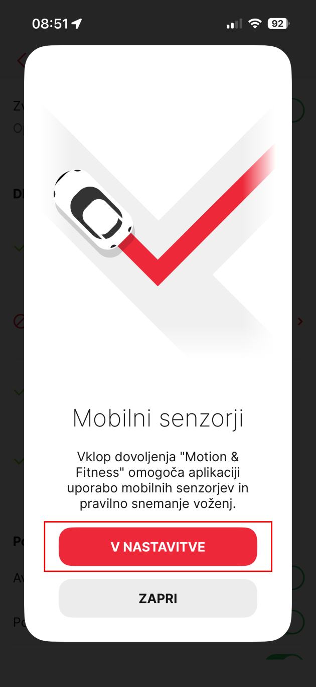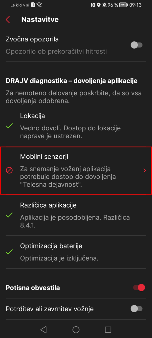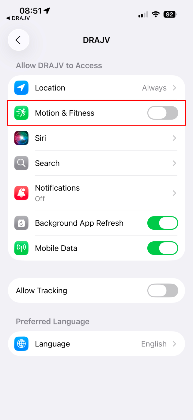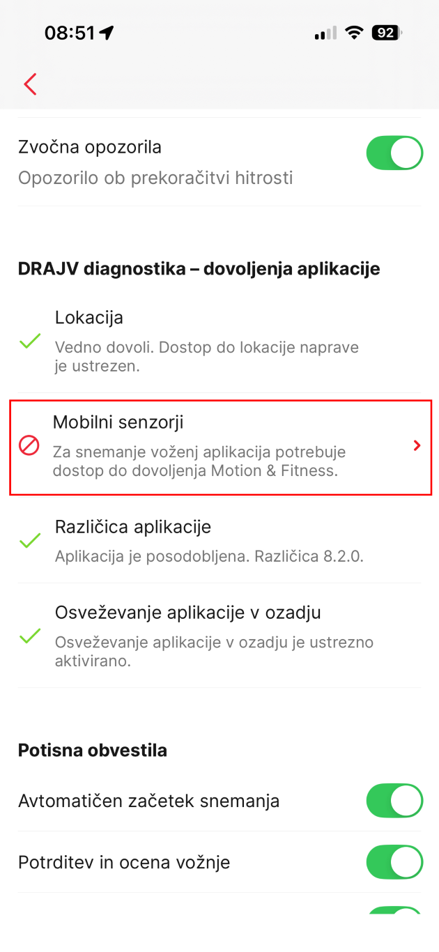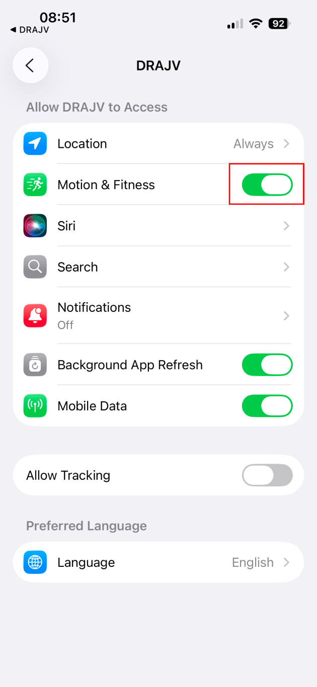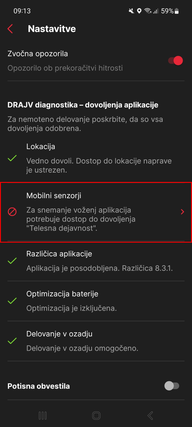 - Preverite, da imate v sistemskih nastavitvah aplikacije DRAJV omogočeno uporabo mobilnih senzorjev. Vklopite nastavitev 'Motion & Fitness'.