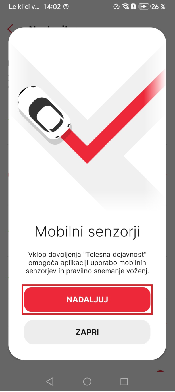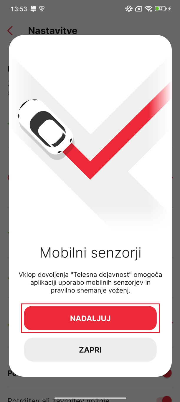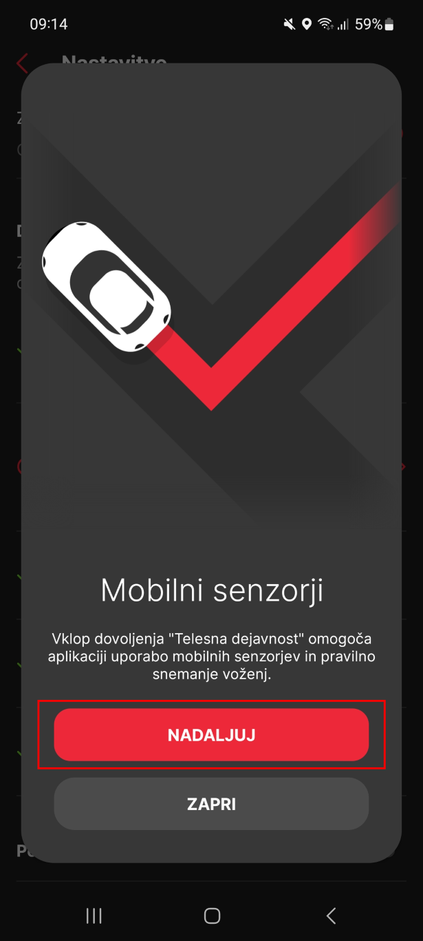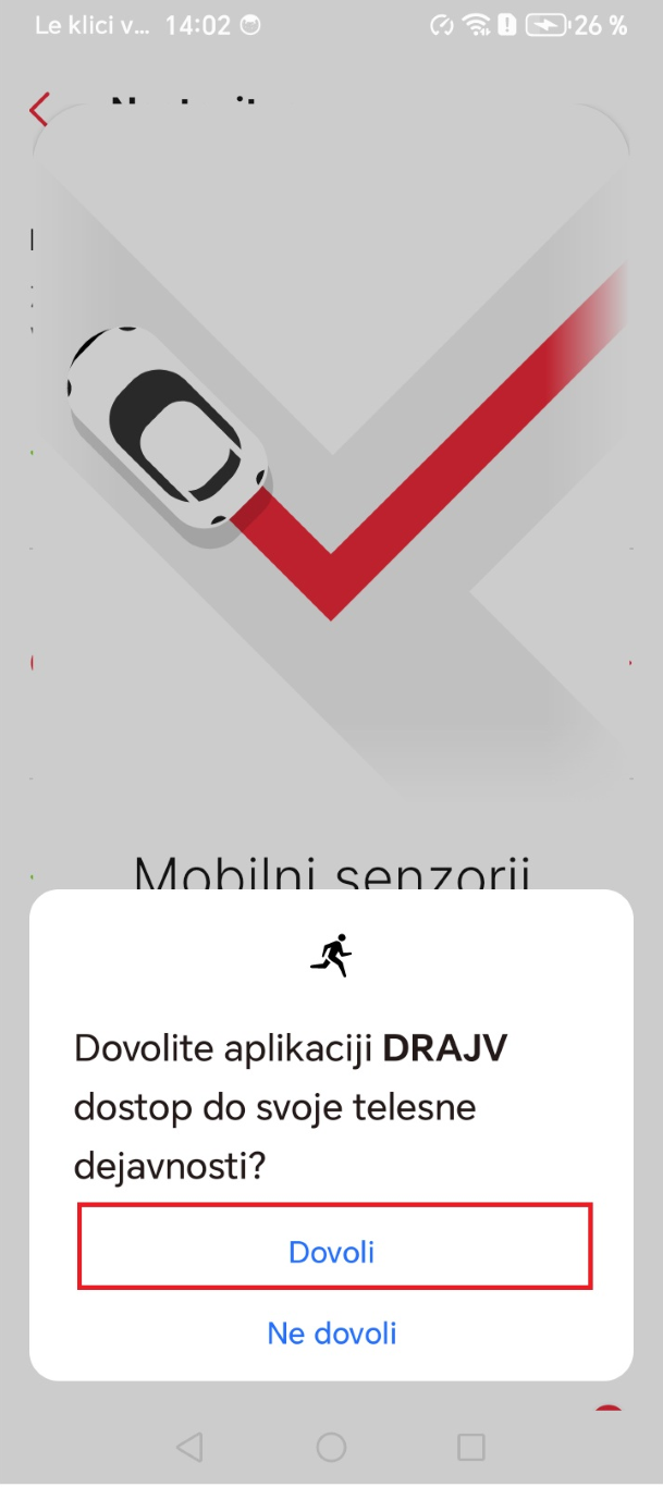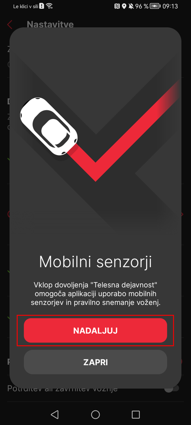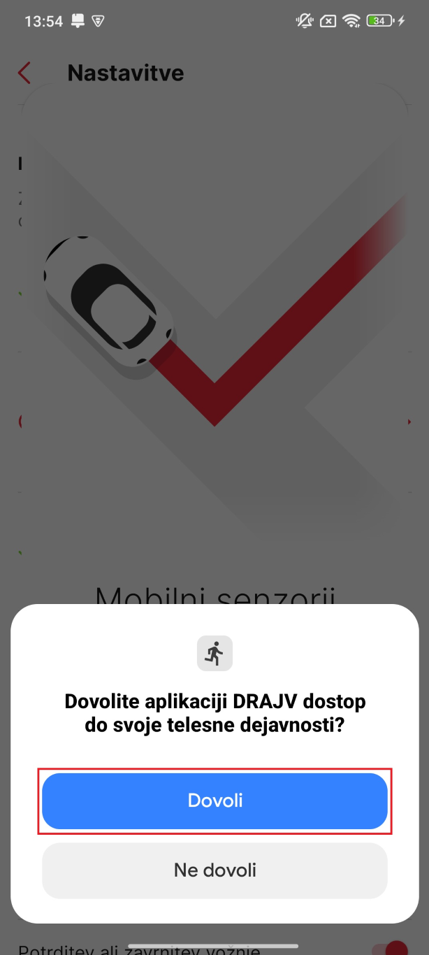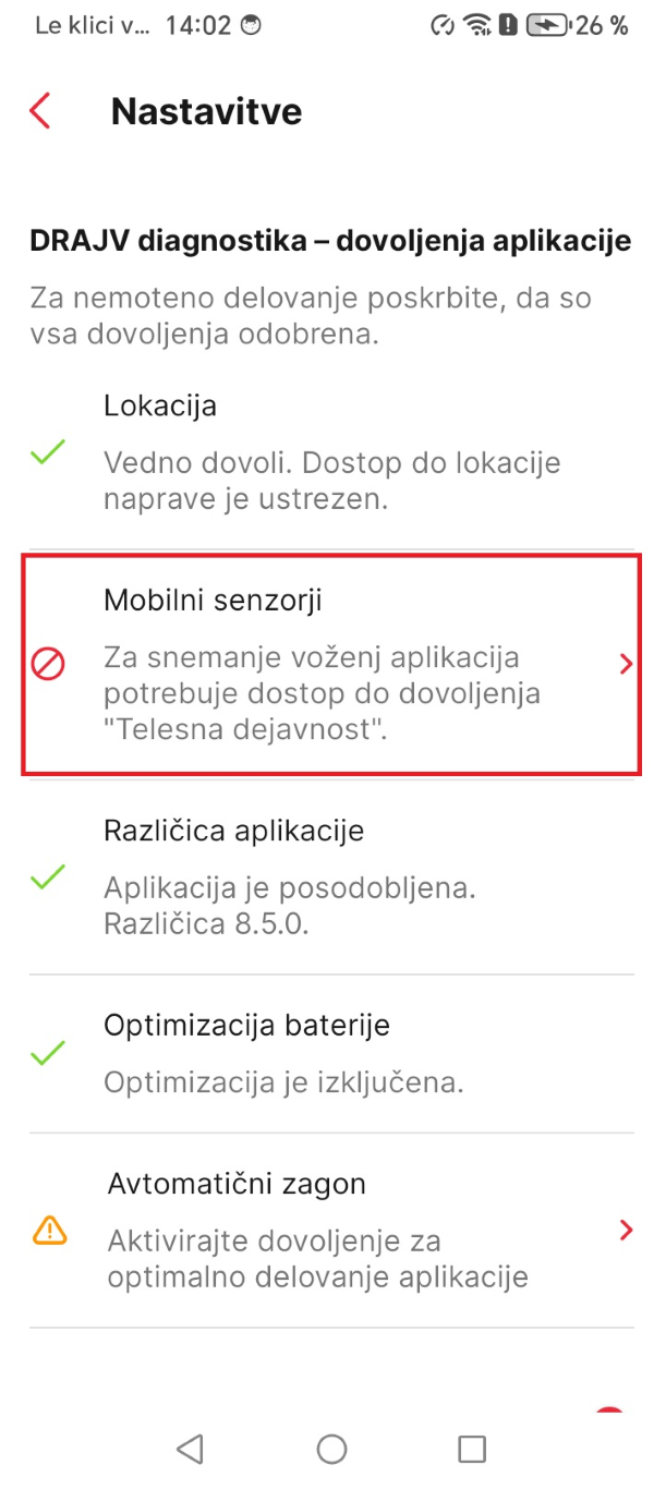 - Preverite, da imate v sistemskih nastavitvah aplikacije DRAJV omogočeno uporabo mobilnih senzorjev. Vklopite nastavitev 'Motion & Fitness'.