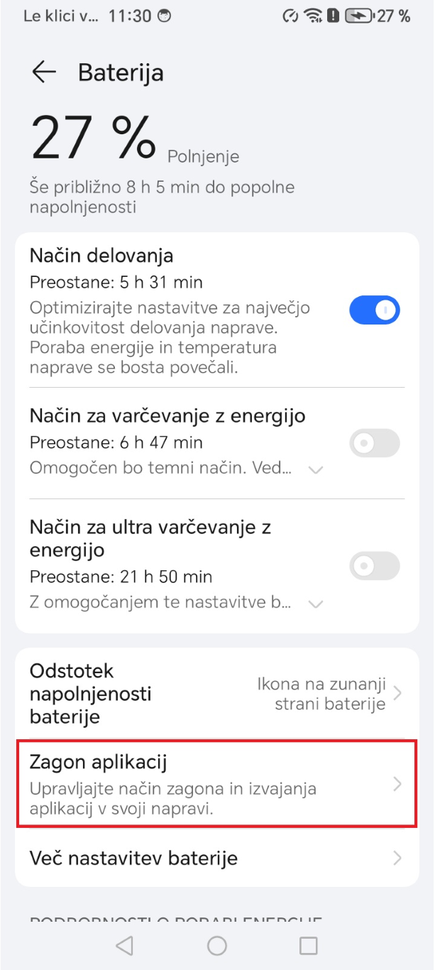 - Preverite, da imate v nastavitvah akumulatorja izklopljen način STAMINA ter prilagodljivo varčevanje z baterijo.