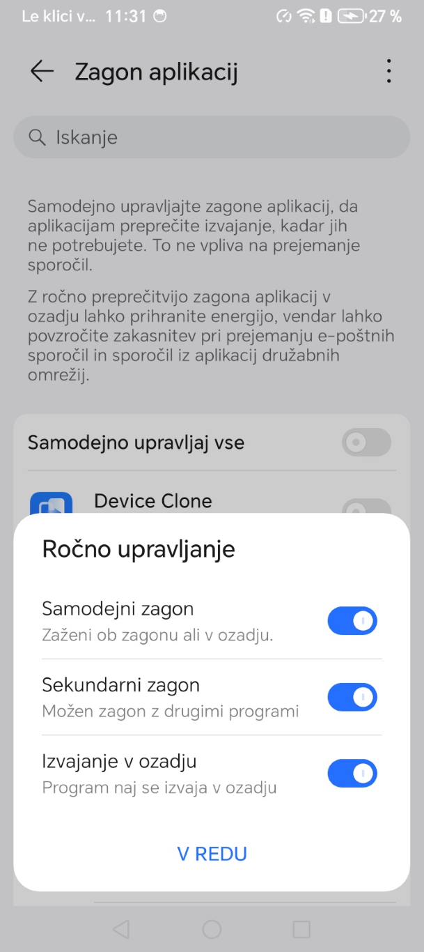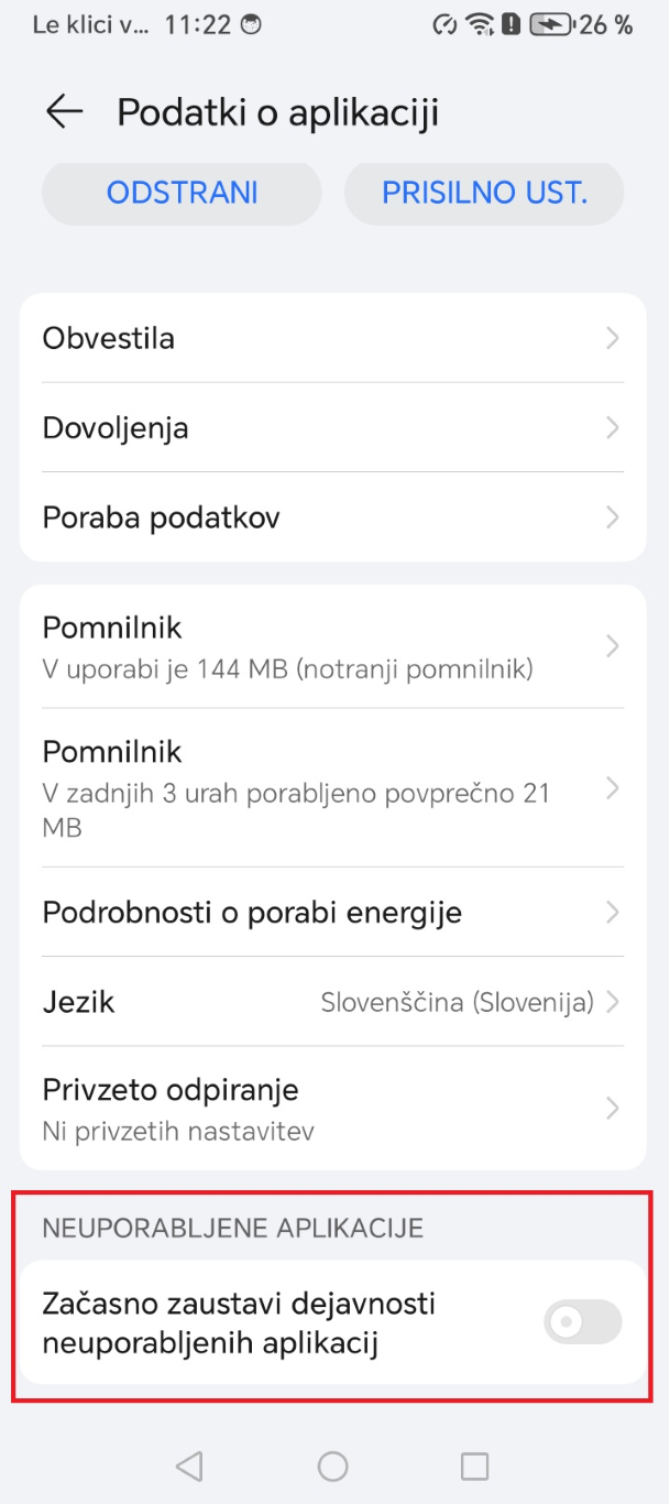 - V nastavitvah dovoljenj za aplikacijo preverite, da je IZKLJUČENO »Prekini dejavnost aplikacije, če je neuporabljena«.