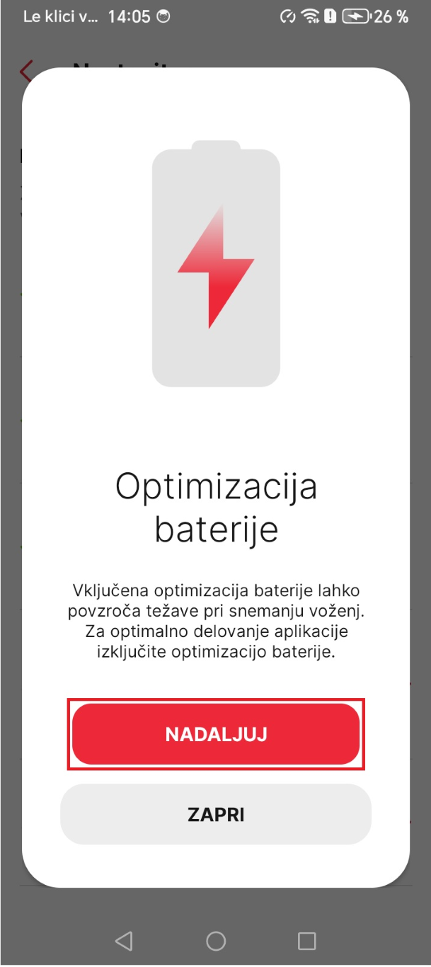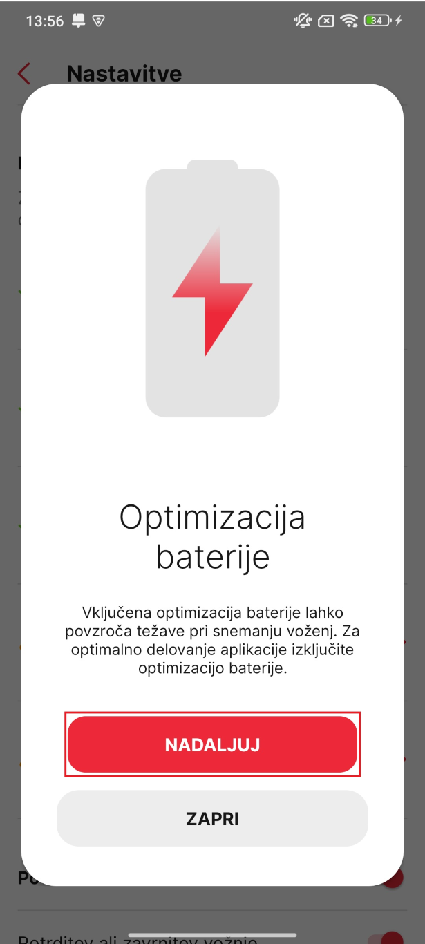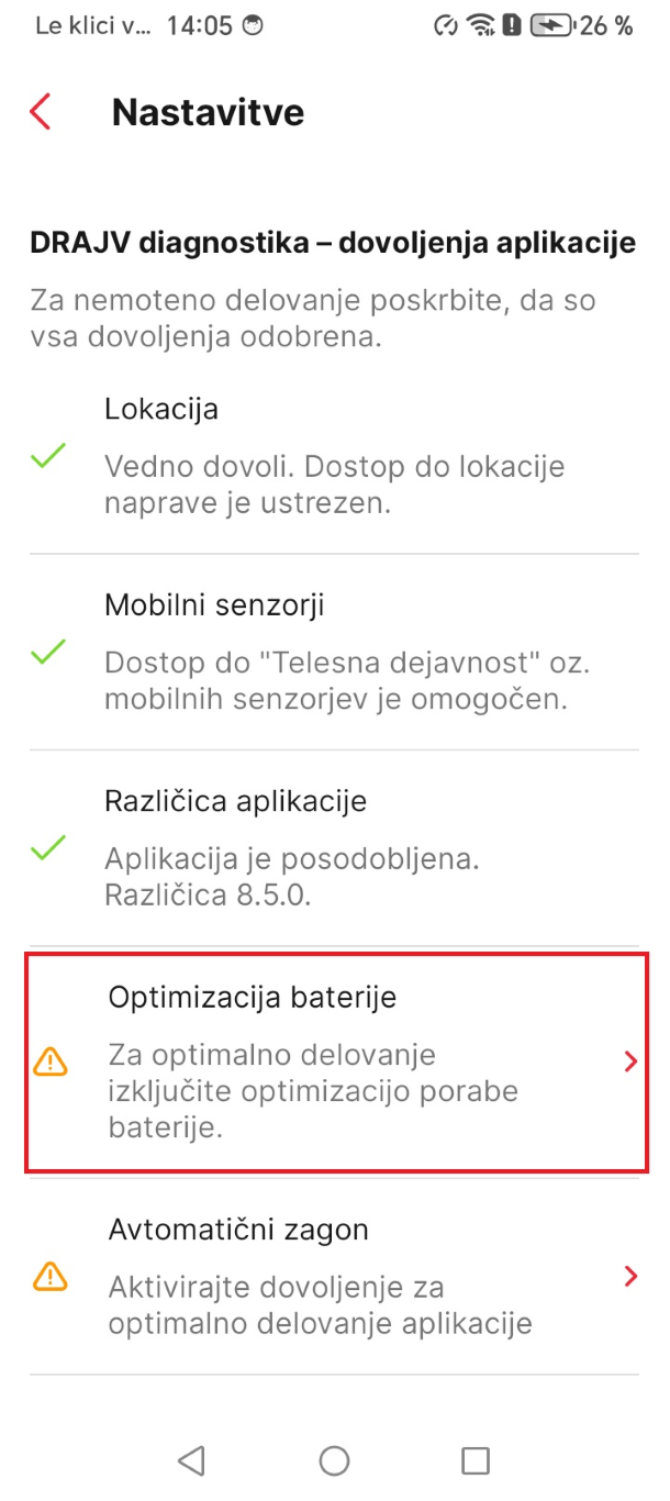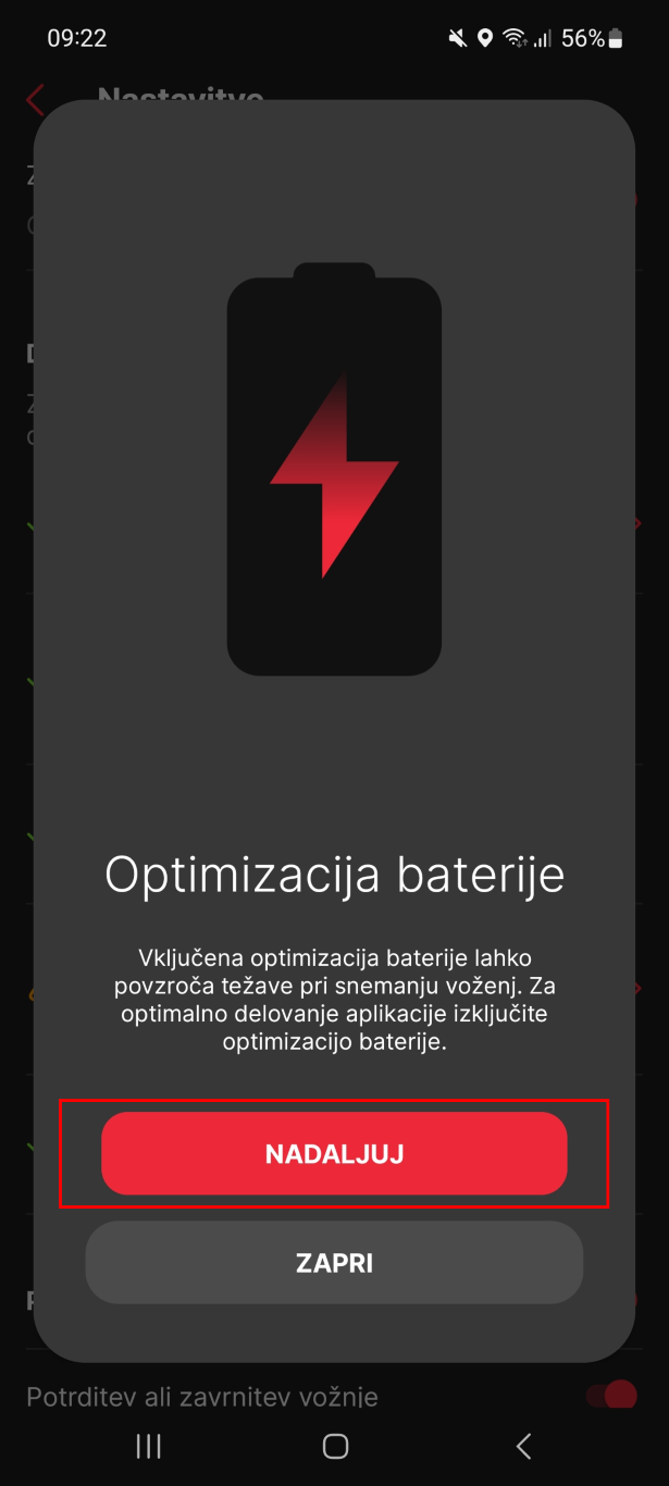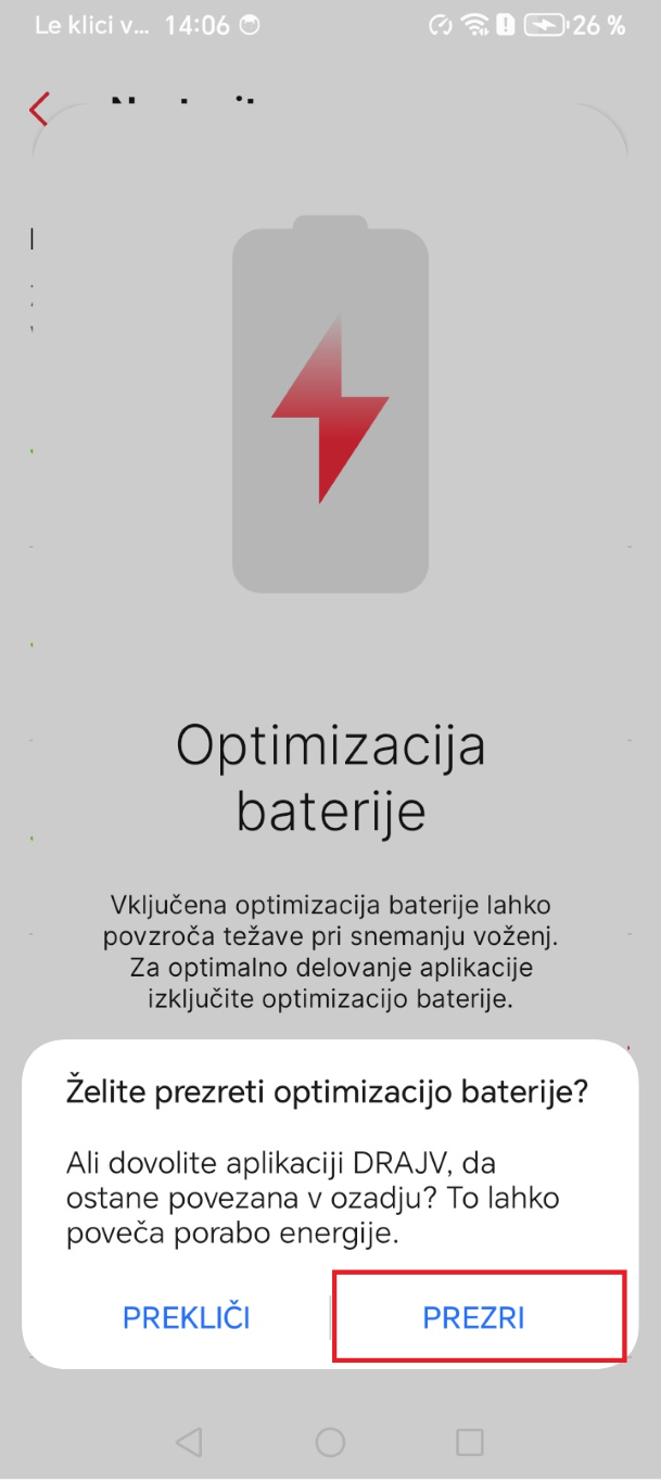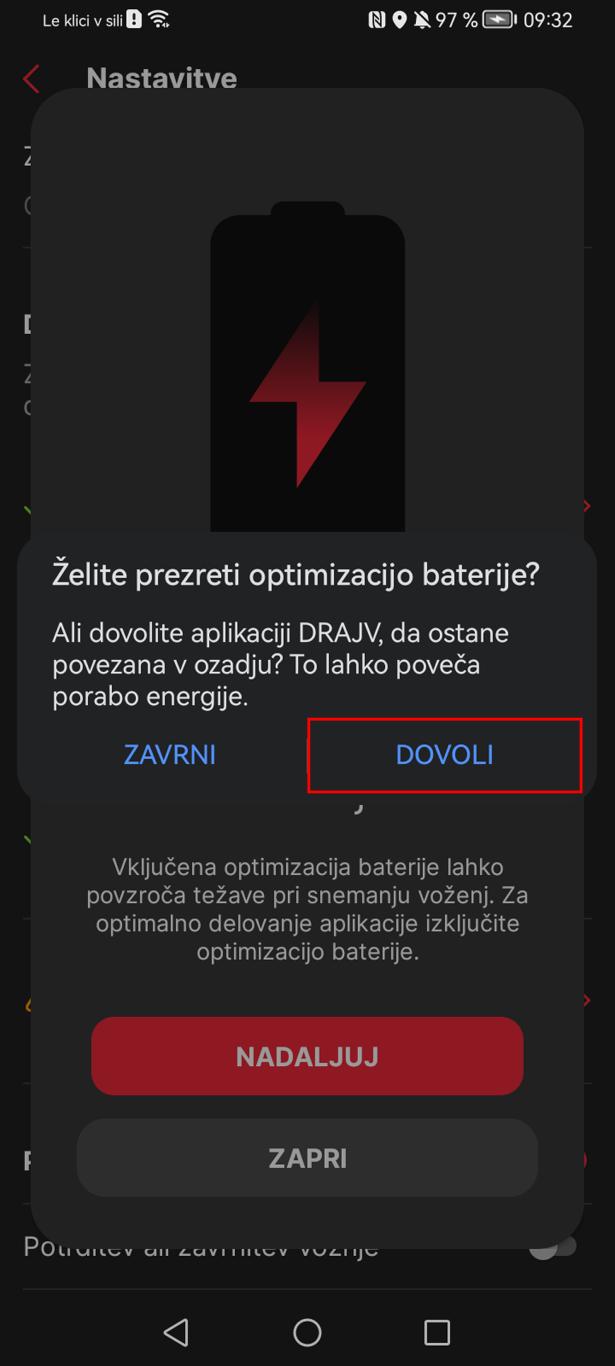 - Dovolite izključitev optimizacije baterije za aplikacijo DRAJV, za delovanje v ozadju.
