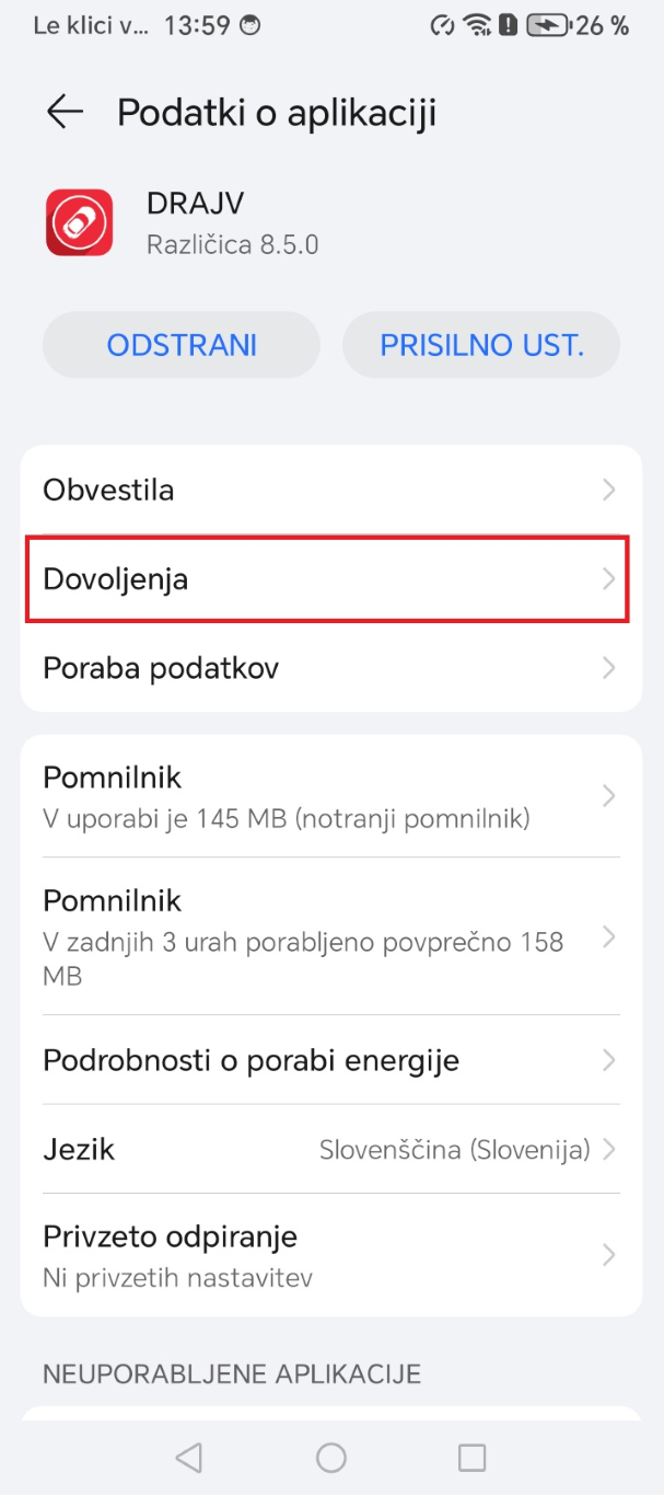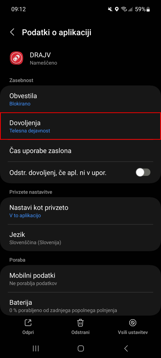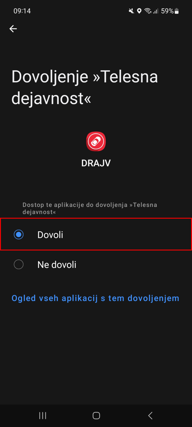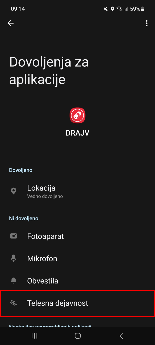Na seznamu nameščenih aplikacij v nastavitvah poiščite aplikacijo DRAJV. Nato izberite 'Dovoljenja za aplikacijo' ter 'Telesna dejavnost', kjer izberete 'Dovoli dostop'. V pomoč so vam lahko spodnja slikovna navodila.