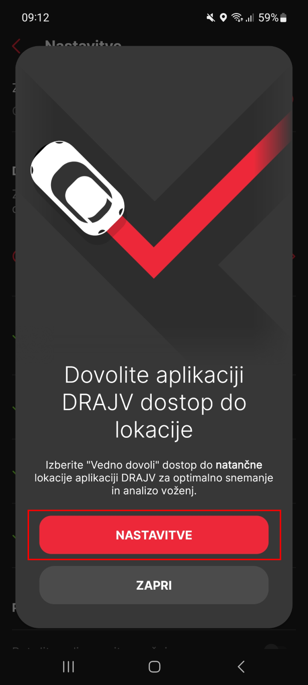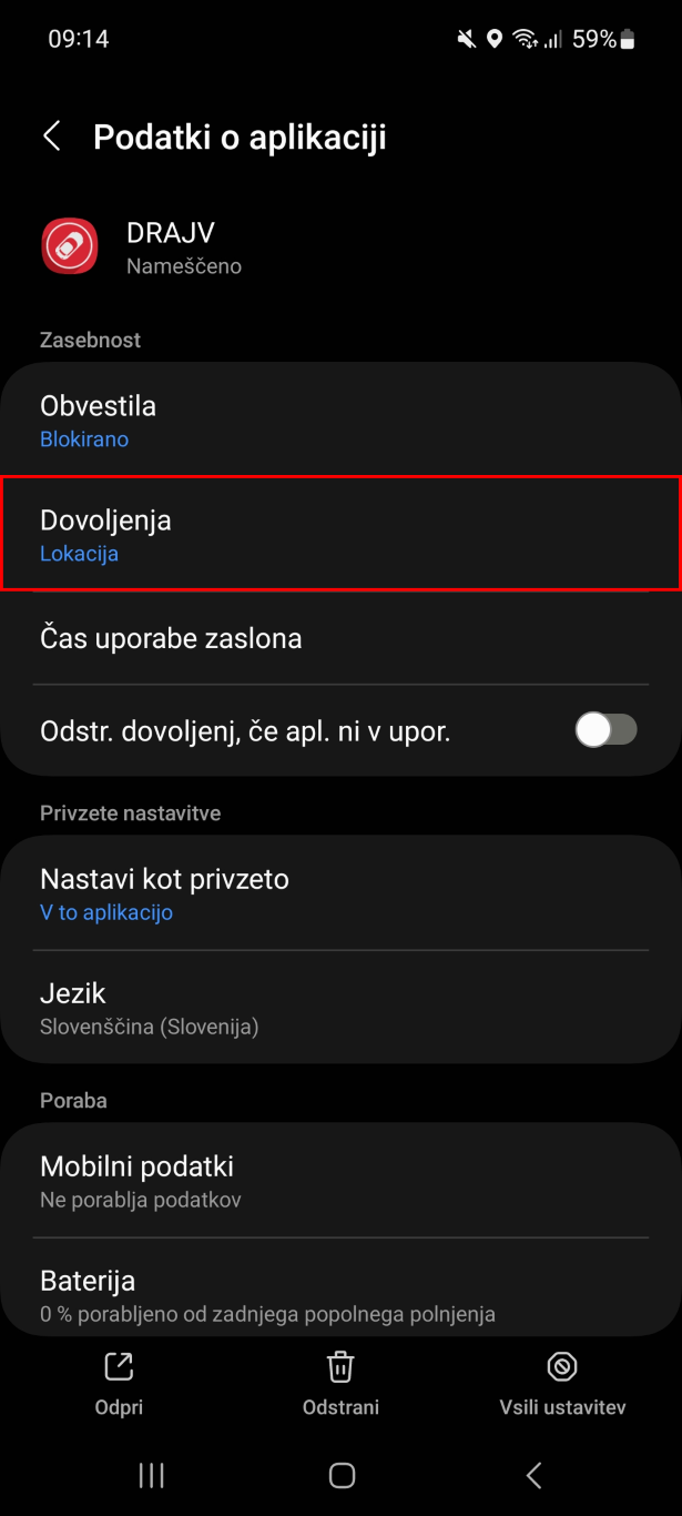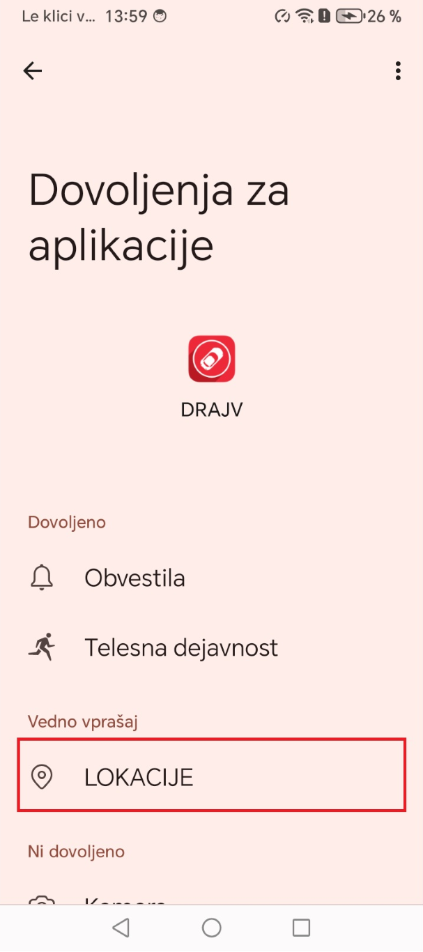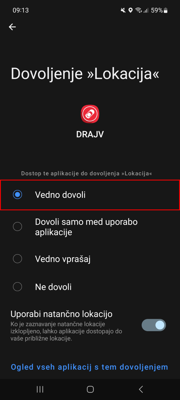 - V nastavitvah dovoljenj ravni aplikacije nato preverite, da ima aplikacija DRAJV dovoljenje za dostop do lokacije.
