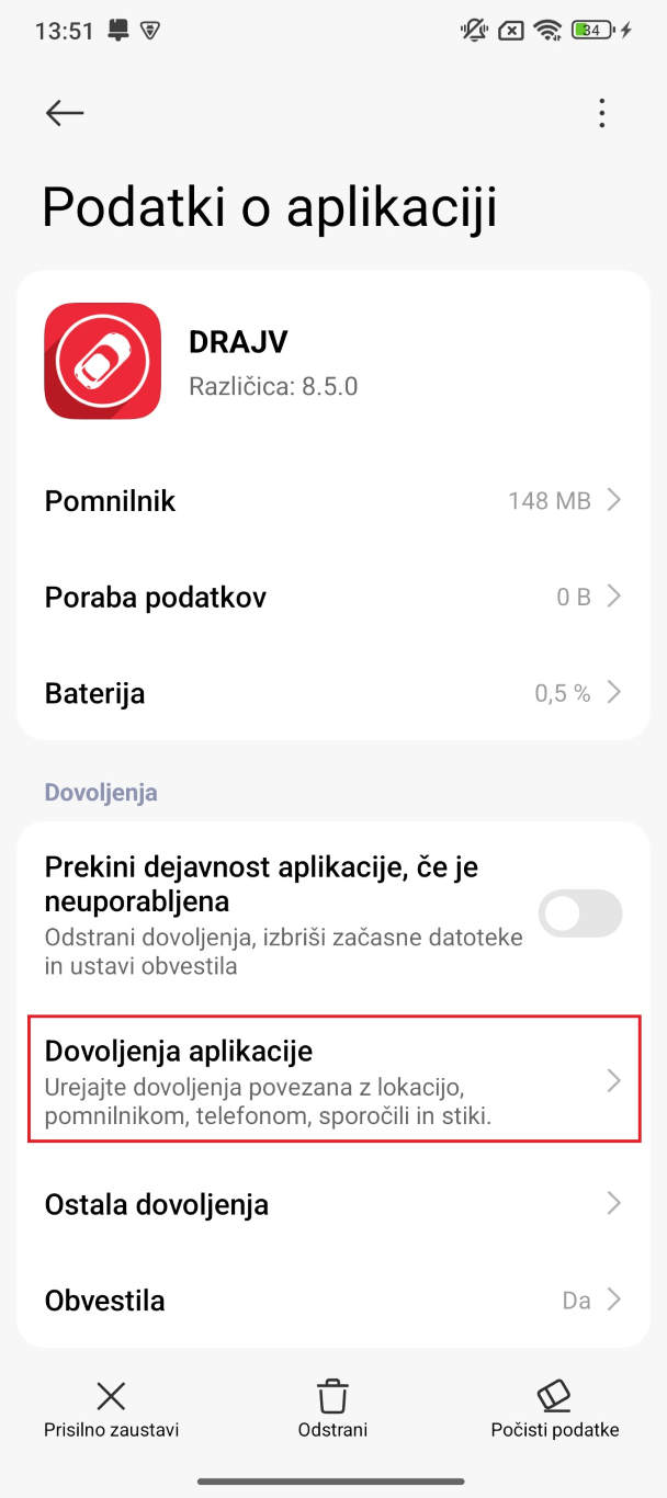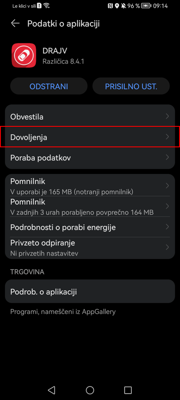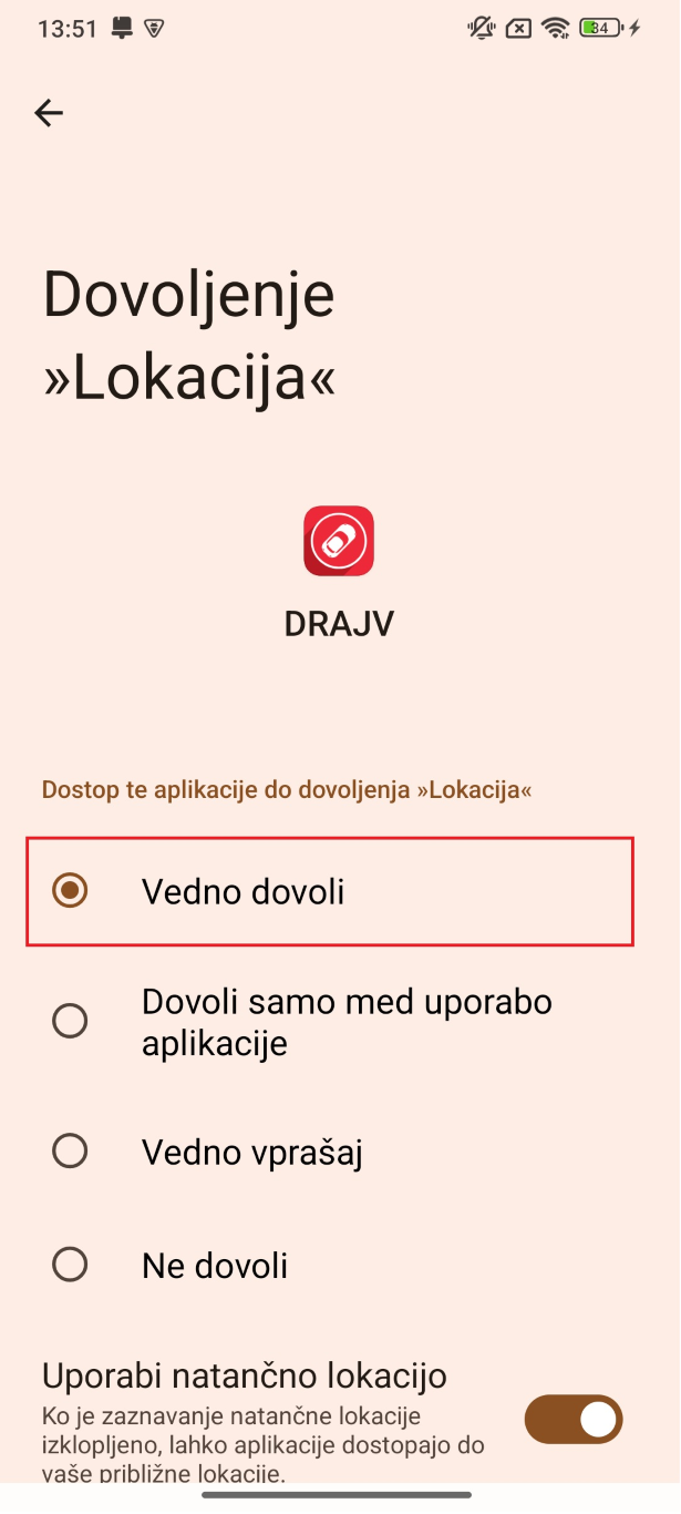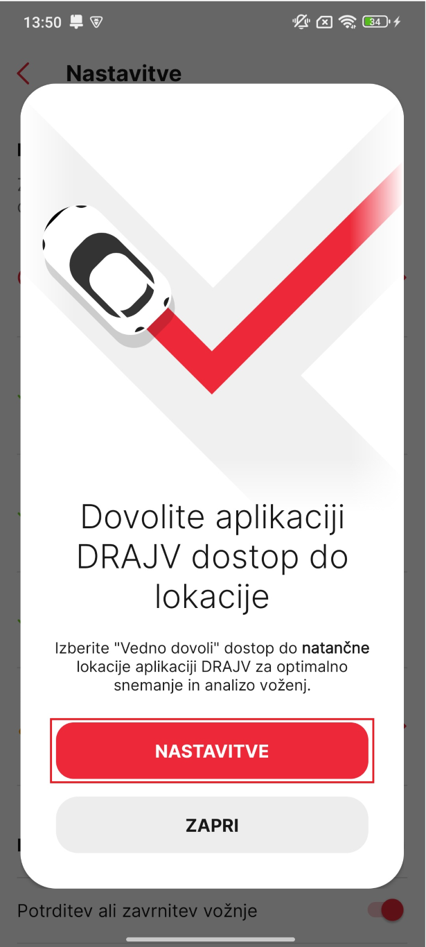 - V nastavitvah dovoljenj ravni aplikacije nato preverite, da ima aplikacija DRAJV dovoljenje za dostop do lokacije.