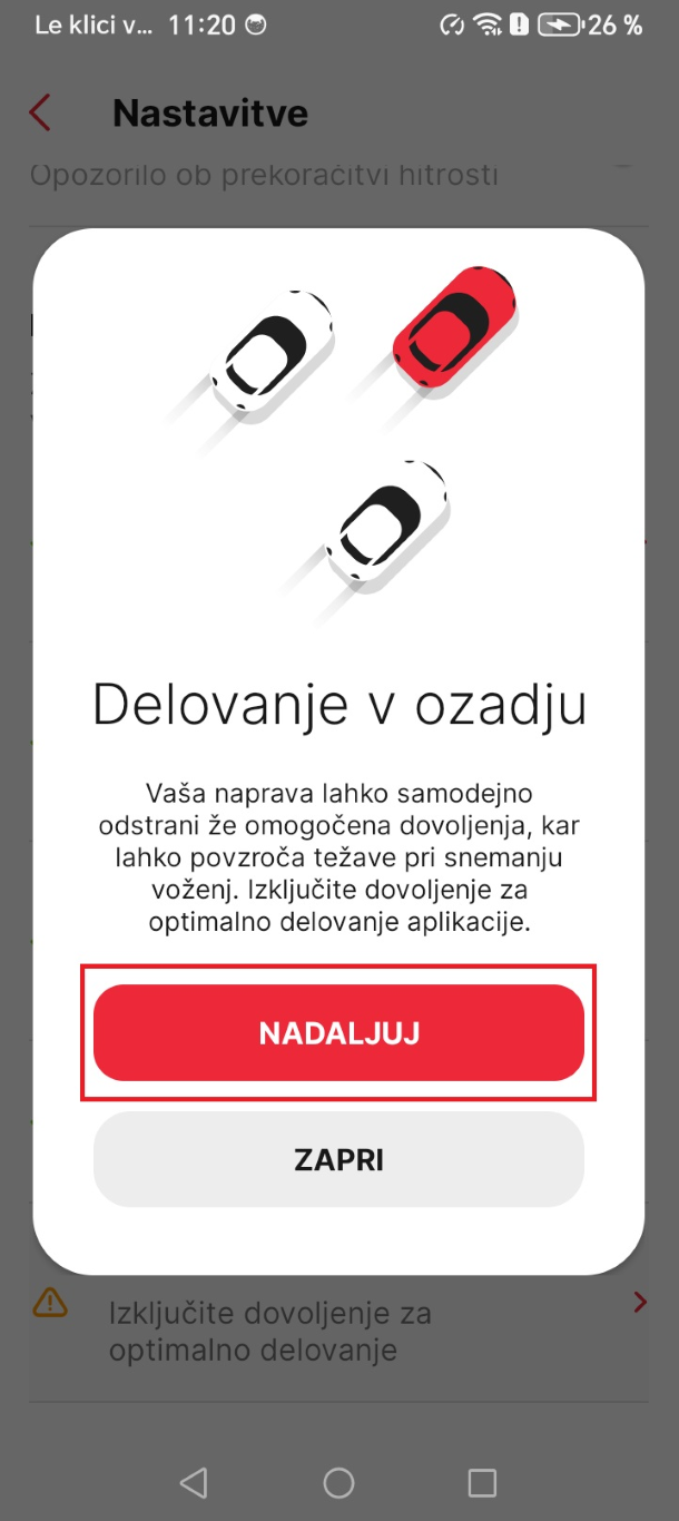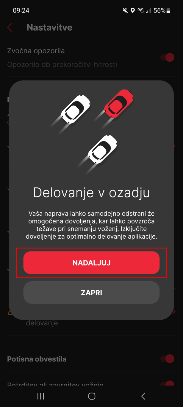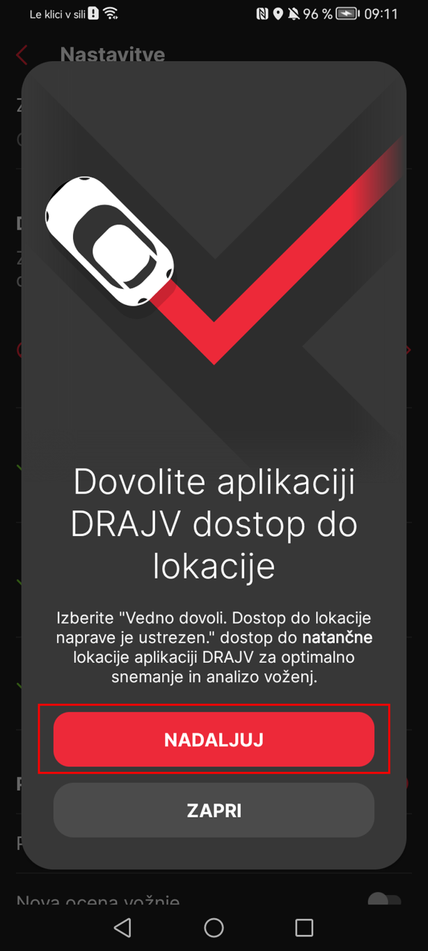 Če imate vključeno možnost avtomatičnega snemanja voženj ali želite uporabljati aplikacijo z ugasnjenim zaslonom je pomembno, da imate nastavitev dostopa do lokacije nastavljeno na 'Vedno dovoli'.