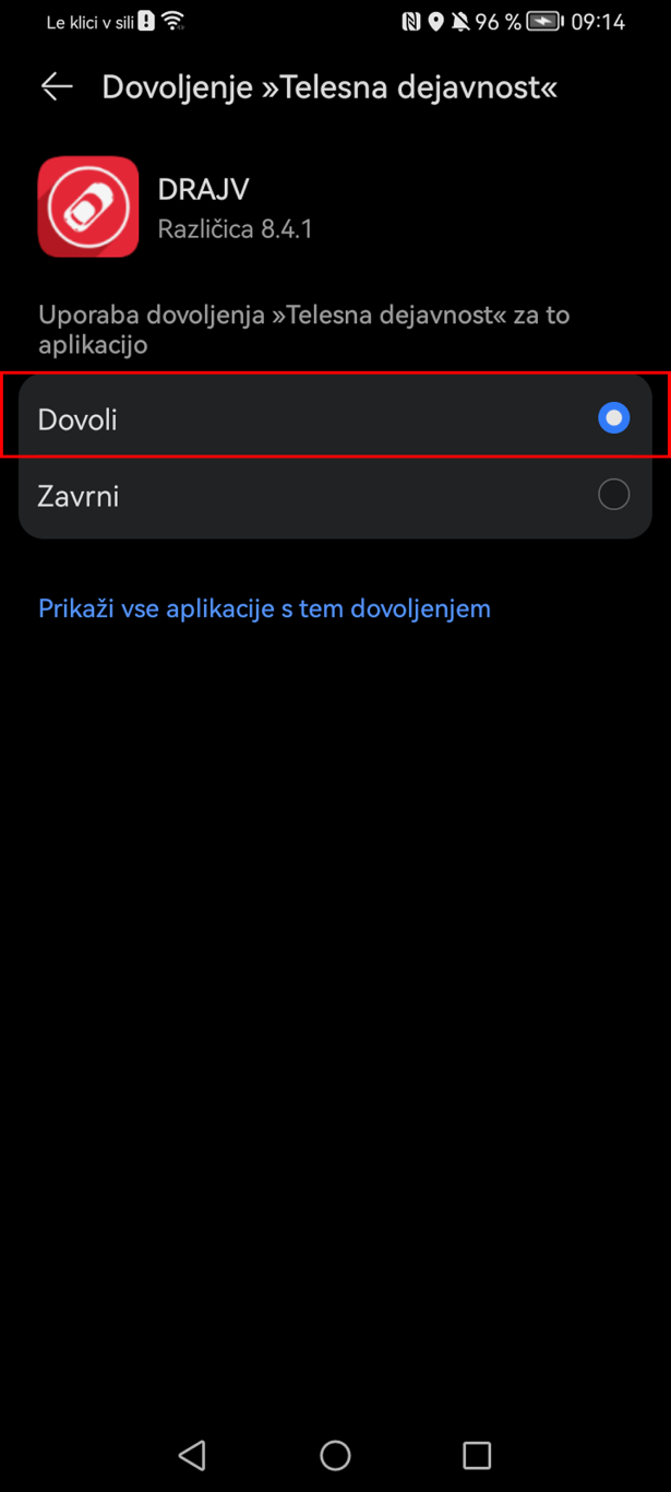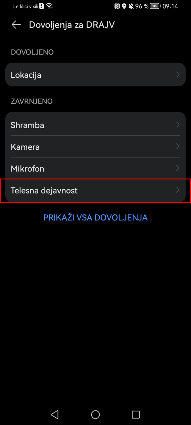 - V nastavitvah dovoljenj za aplikacijo preverite, da je dovoljenje »Telesna dejavnost« za aplikacijo DRAJV nastavljeno na 'Dovoli'.