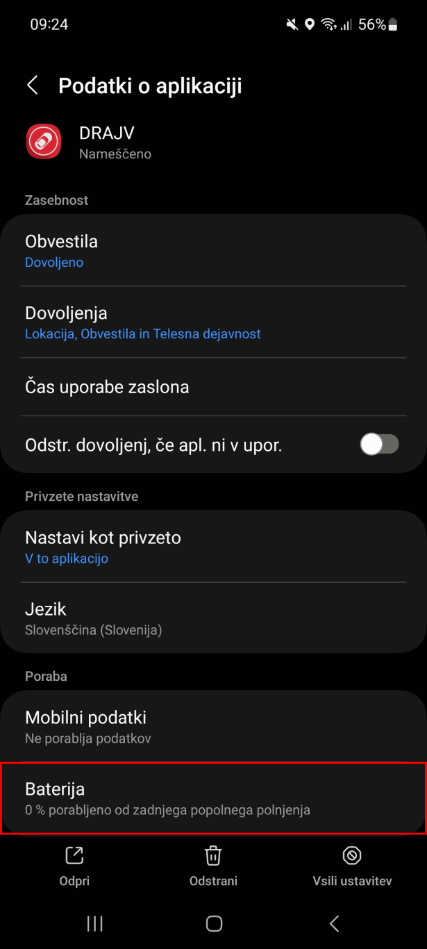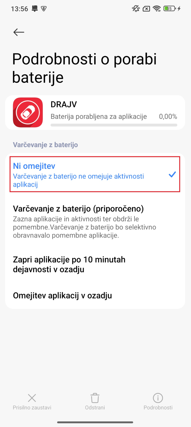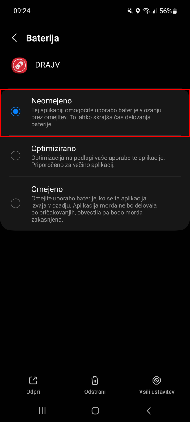 - V nastavitvah podatkov aplikacij poiščite aplikacijo DRAJV. Izberite 'Baterija'. Preverite, da imate izbrano možnost »Neomejeno«.