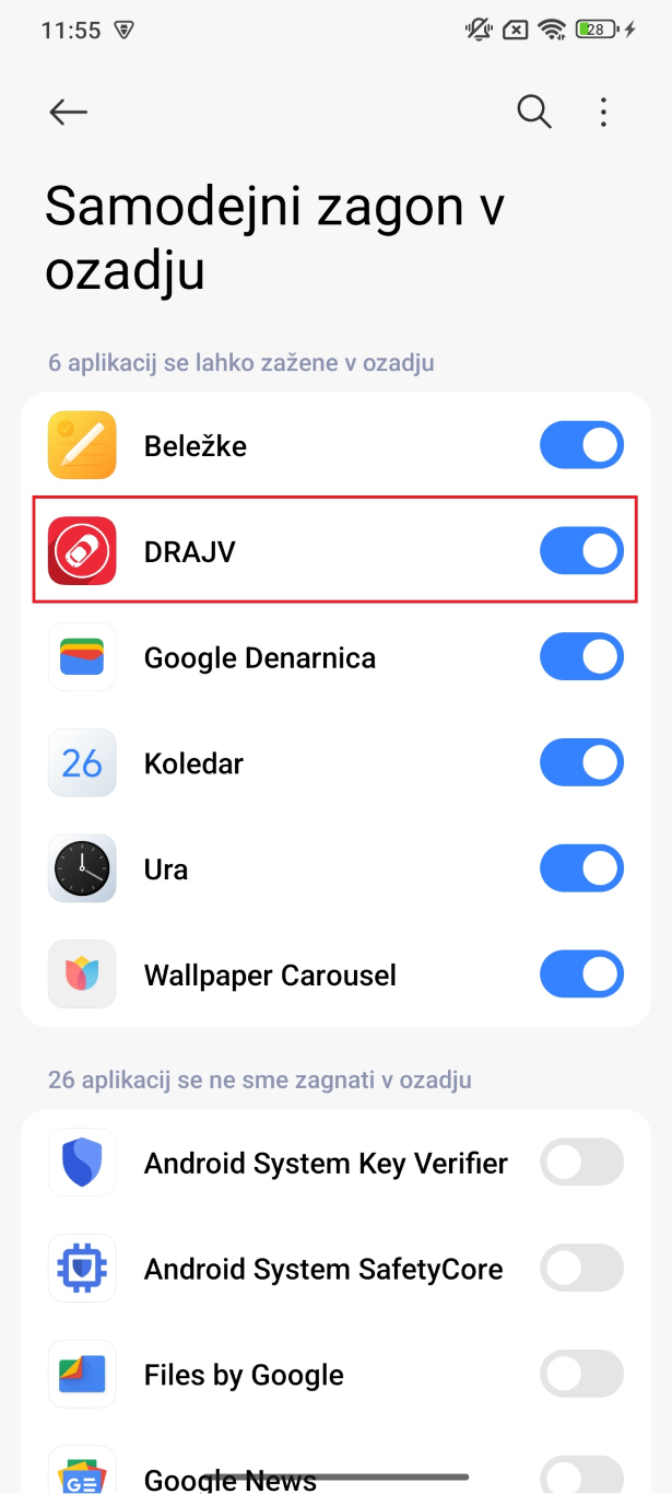 - V nastavitvah podatkov aplikacij poiščite aplikacijo DRAJV. Izberite 'Samodejni zagon v ozadju'. Preverite, da je VKLJUČENO možnost samodejnega zagona za aplikacijo DRAJV.
